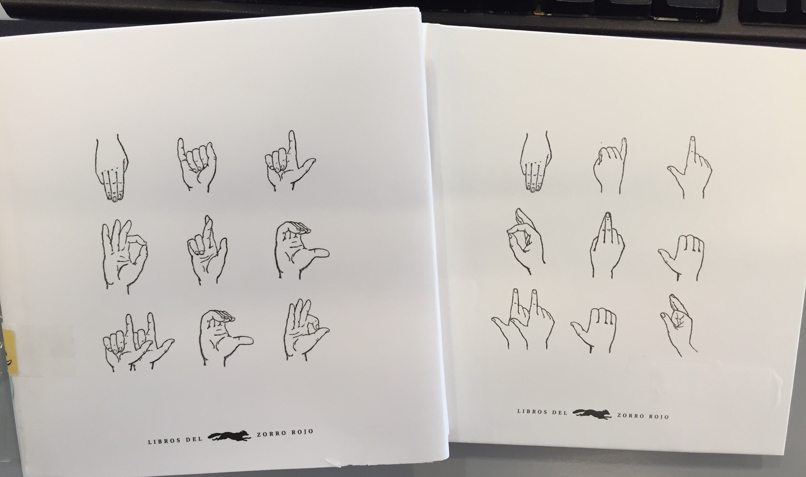 Ho valoro especialment perquè probablement aquest error hauria passat desapercebut per molts dels lectors donat que la llengua de signes no és molt coneguda, i perquè mirant la targeta amb l’abecedari dactilogràfic que inclou el llibre es veuria que les lletres es corresponen. Tot i així, si mireu les dos cobertes de seguida detectareu que alguna cosa passa… per exemple amb la lletra «L».