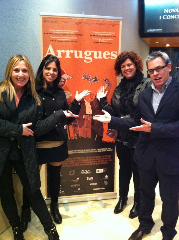 Montse Balada (autora), Cesca Mestres (editora) i Manuel Cristobal (productor de cinema i guionista) al pase previ a l’estrena de la pel·lícula basada en el seu còmic Arrugas [gener 2012]