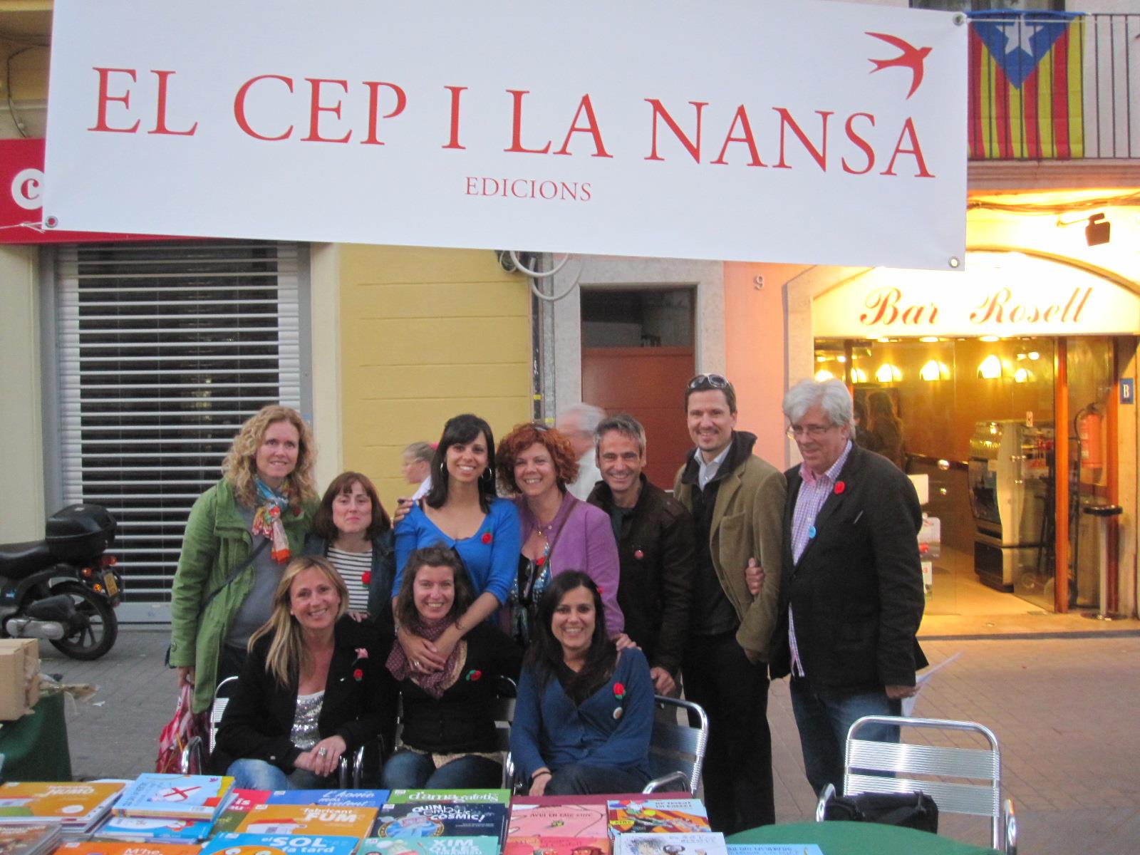 Amb les autores Marta Minella i Monte Balada, l’il·lustrador Sebastià Serra, els editors Quico i Cesca Mestres i un munt d’amics a la paradeta de Sant Jordi 2013. [abril 2013]