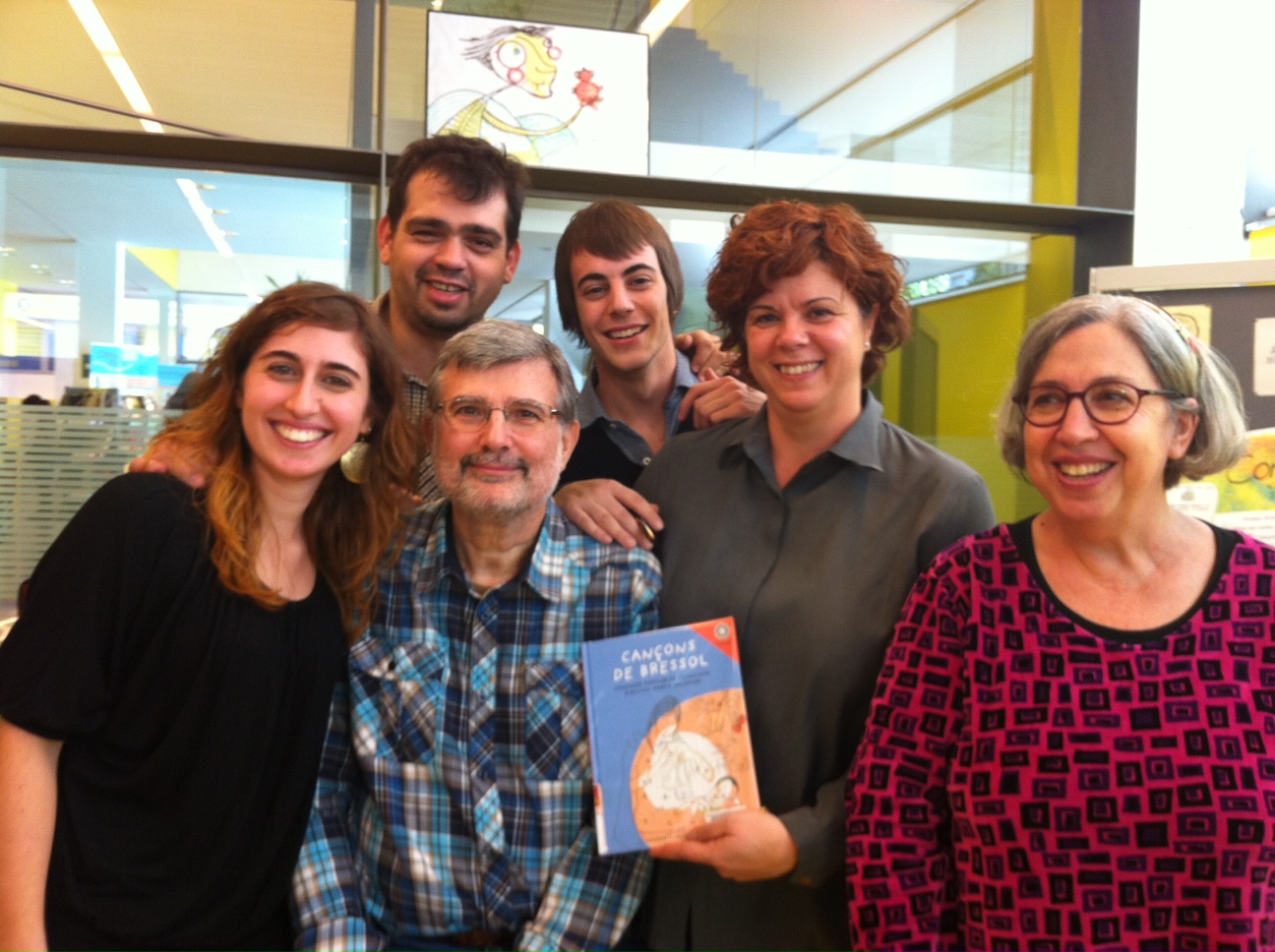 Marta Balaguer (il·lustradora), Ricard i Marta Casals (veus), Iñaqui Marquiategui (arranjaments i teclat) i en Charli, al baix… A la biblioteca Armand Cardona per a la presentació del llibre Contes bressol de Publicacions de l’Abadia de Montserrat.